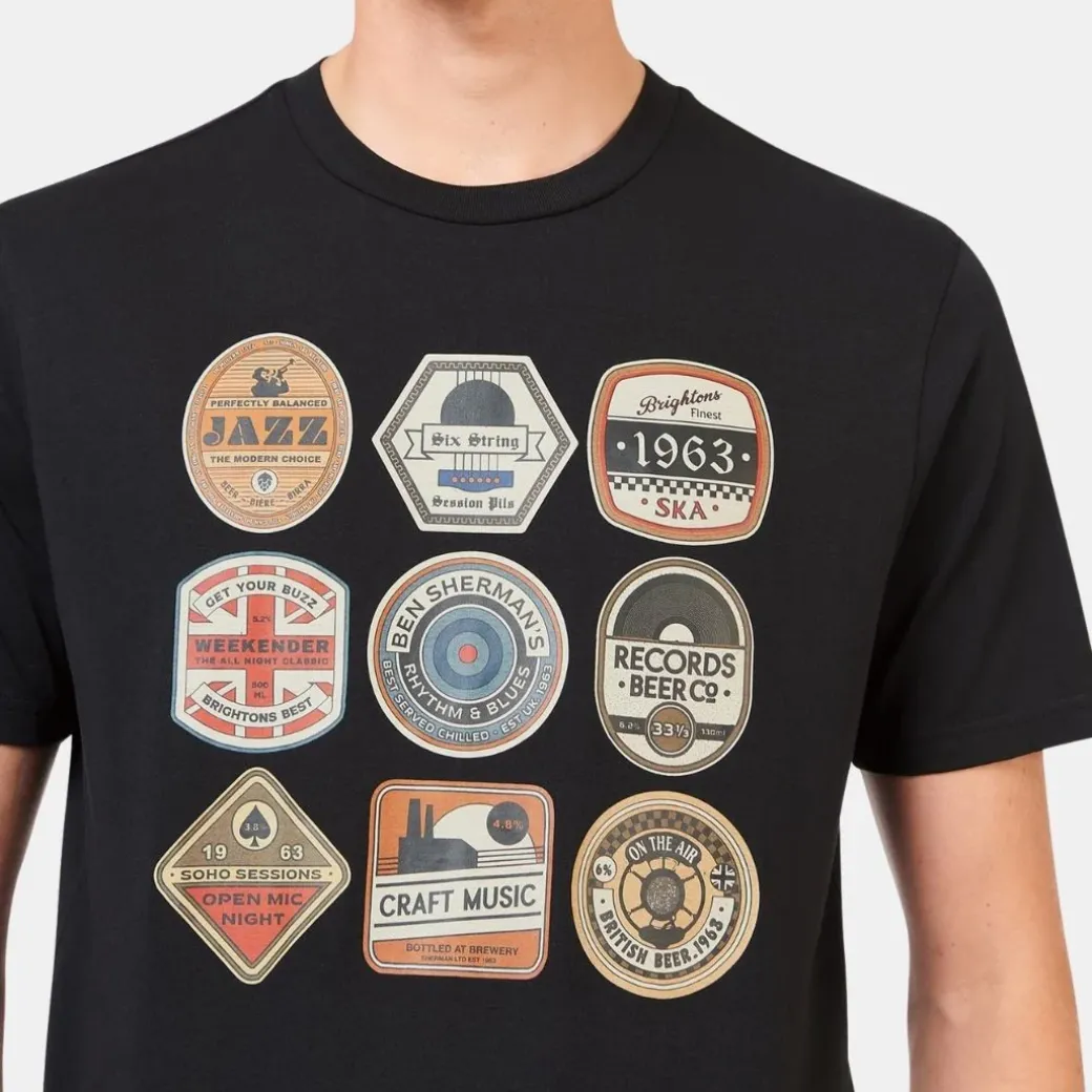 Camiseta 100% algodón orgánico certificado GOTS. Esta camiseta de corte estándar presenta posavasos de cerveza inspirados en la música con un estampado por transferencia de calor.