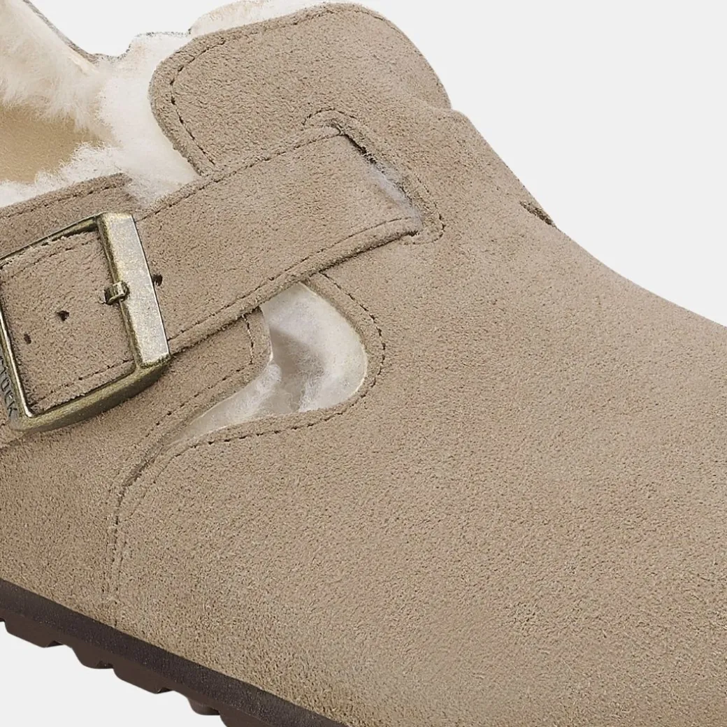 El modelo London de BIRKENSTOCK es una variación basada en el clásico Boston. La zona del talón elevada caracteriza a este zapato sencillo y sin costuras. El modelo entusiasma por su aspecto rústico y natural, así como por estar confeccionado con borde roto y sin forro. Este modelo clásico se presenta aquí en una versión adorable con lana de borrego. ¡El calzado perfecto para una acogedora noche de invierno frente a la chimenea! El aspecto natural también se consigue gracias al material superior de ante especialmente suave que se adapta al pie como un guante.