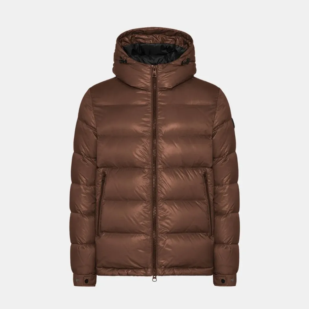Plumífero plegable en nailon superligero semitransparente con acabado súper brillante. Cierre frontal con cremallera de doble cursor y cremallera bajo de neopreno con logo en relieve en el interior. Capucha ajustable con cordón, bolsillos laterales con cremallera y cordón en el bajo para regular el calce. Puño elástico con tira ajustable con botones a presión y bolsillos internos multifuncionales. La prenda, caracterizada por el logo estampado en toda la prenda en el forro, se puede plegar en el bolsillo interno con cremallera para convertirse en un bolso con bandolera.