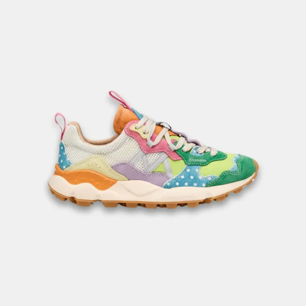 Zapatilla con construcción outdoor, con parte superior en tejido técnico. Las inserciones de ante multicolor se complementan con detalles de piel de poni de colores con estampado de lunares. Forro de piel y plantilla de corcho natural antibacteriano. Suela de goma con dibujo dentado.