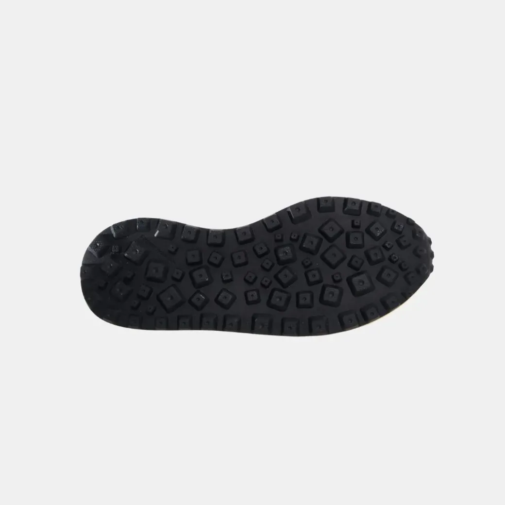 Zapatilla baja fabricada en tejido técnico y ante, con cintas laterales y cordones de trekking. Plantilla de corcho natural antibacteriano y suela de goma ultraligera con dibujo dentado.