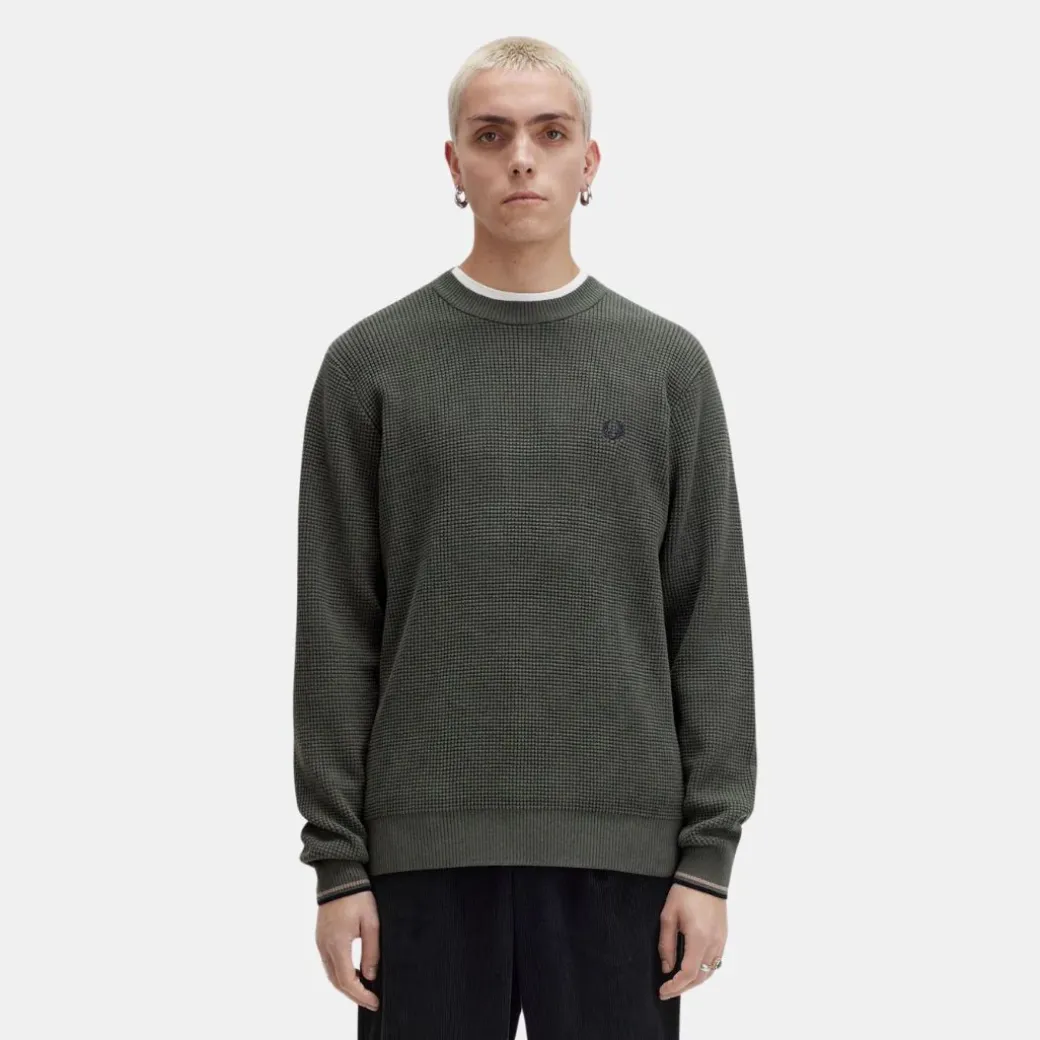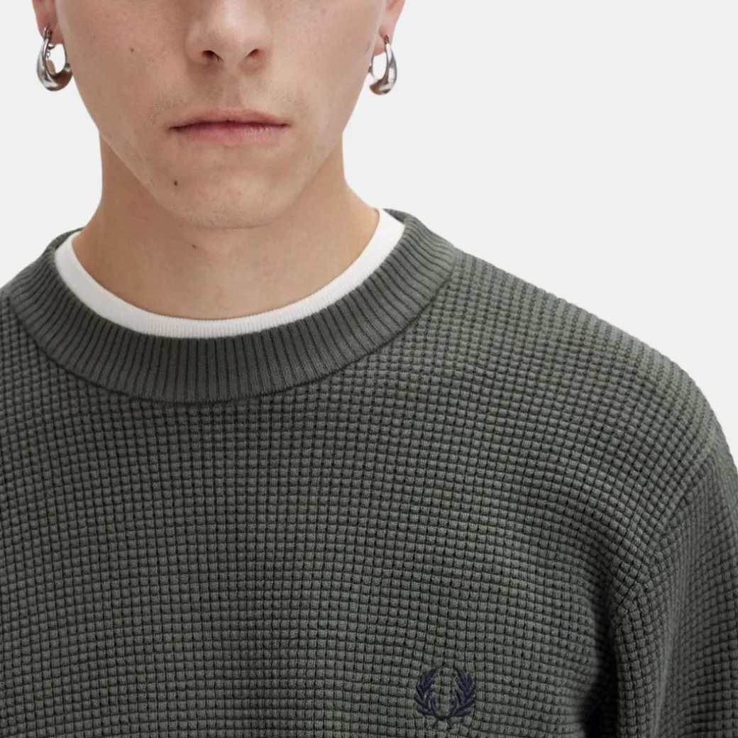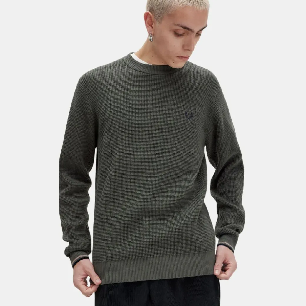 Este jersey de cuello redondo es una elegante prenda de abrigo con sutiles detalles Fred Perry. Destaca por su textura de punto gofrado, un homenaje a las cuadrículas y cuadrados de la geometría deportiva.