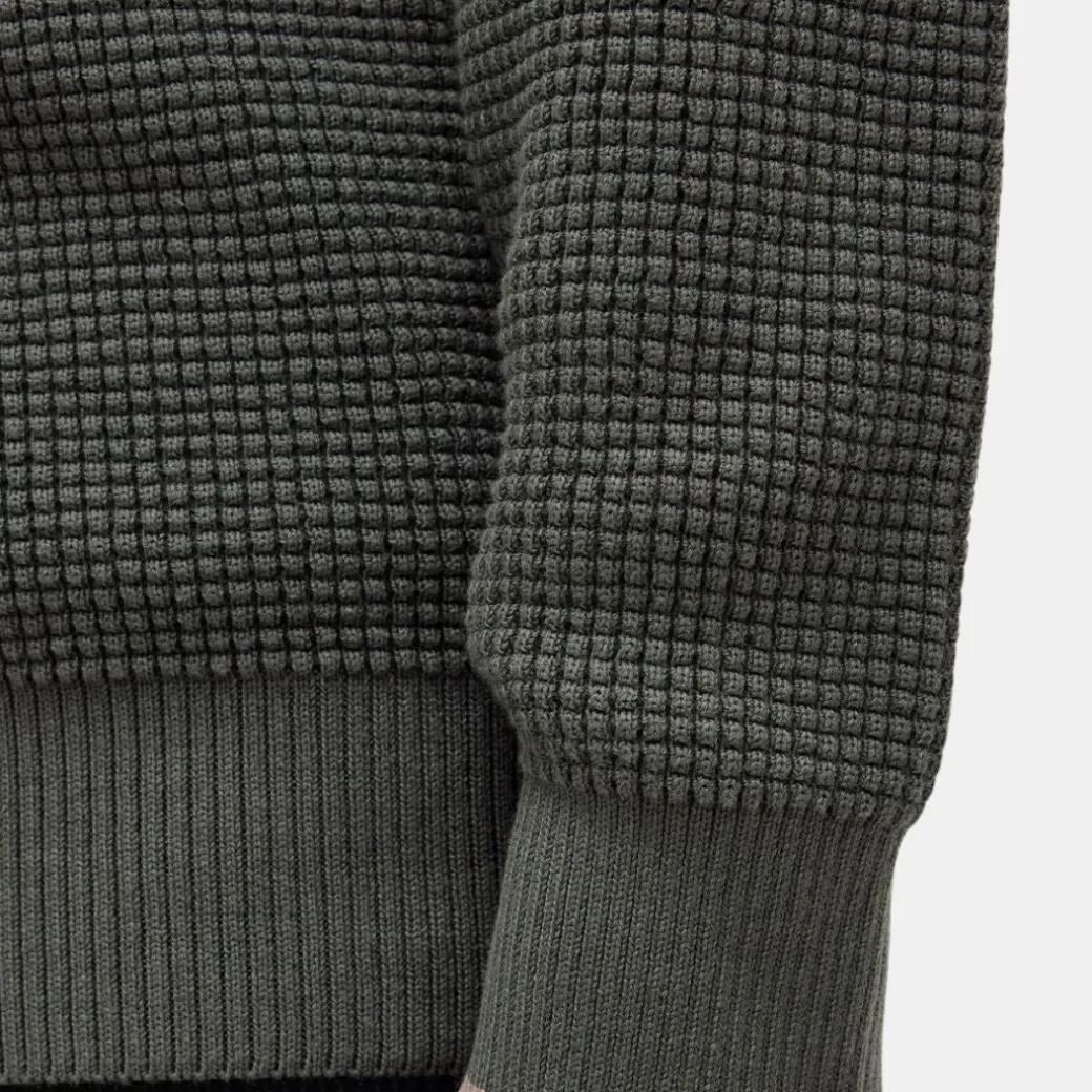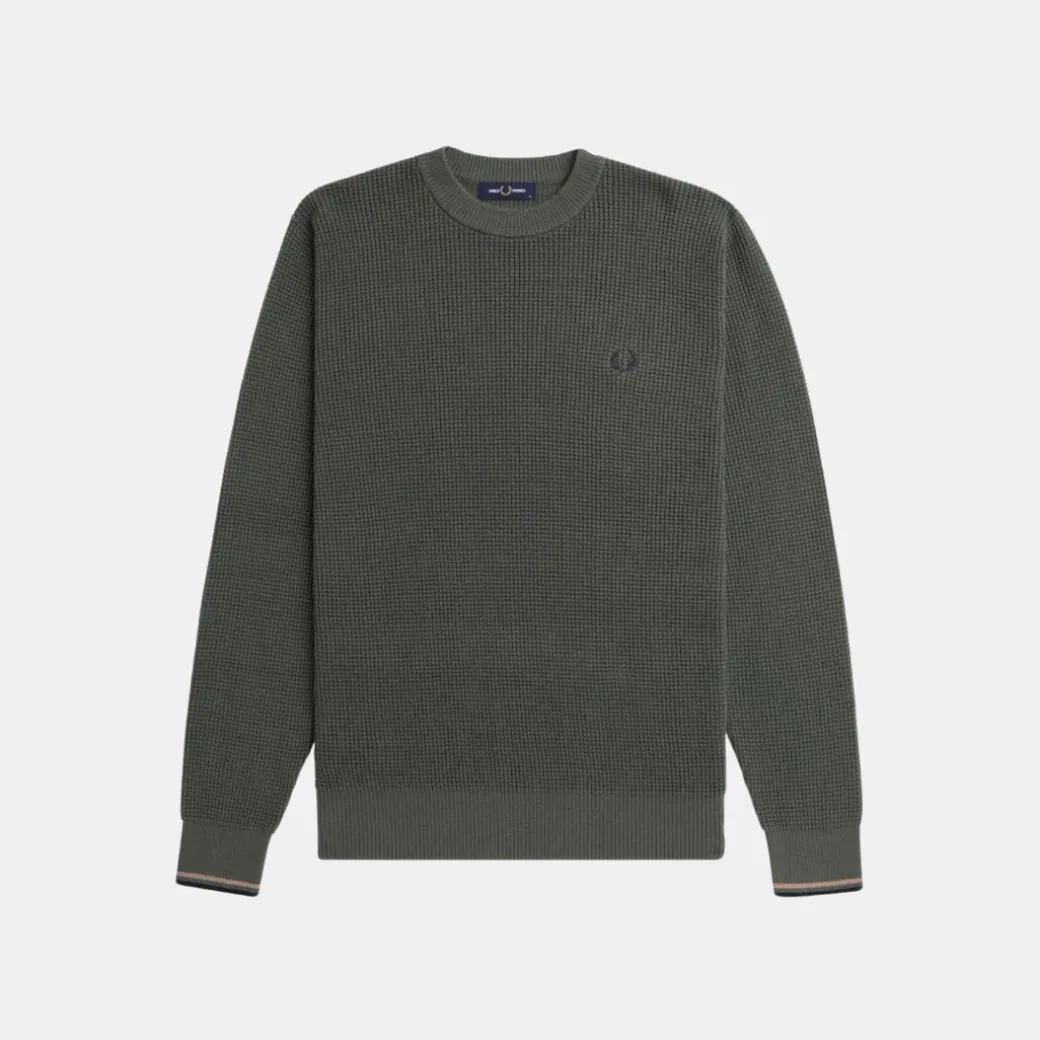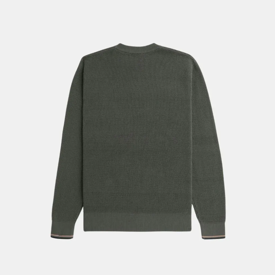 Este jersey de cuello redondo es una elegante prenda de abrigo con sutiles detalles Fred Perry. Destaca por su textura de punto gofrado, un homenaje a las cuadrículas y cuadrados de la geometría deportiva.
