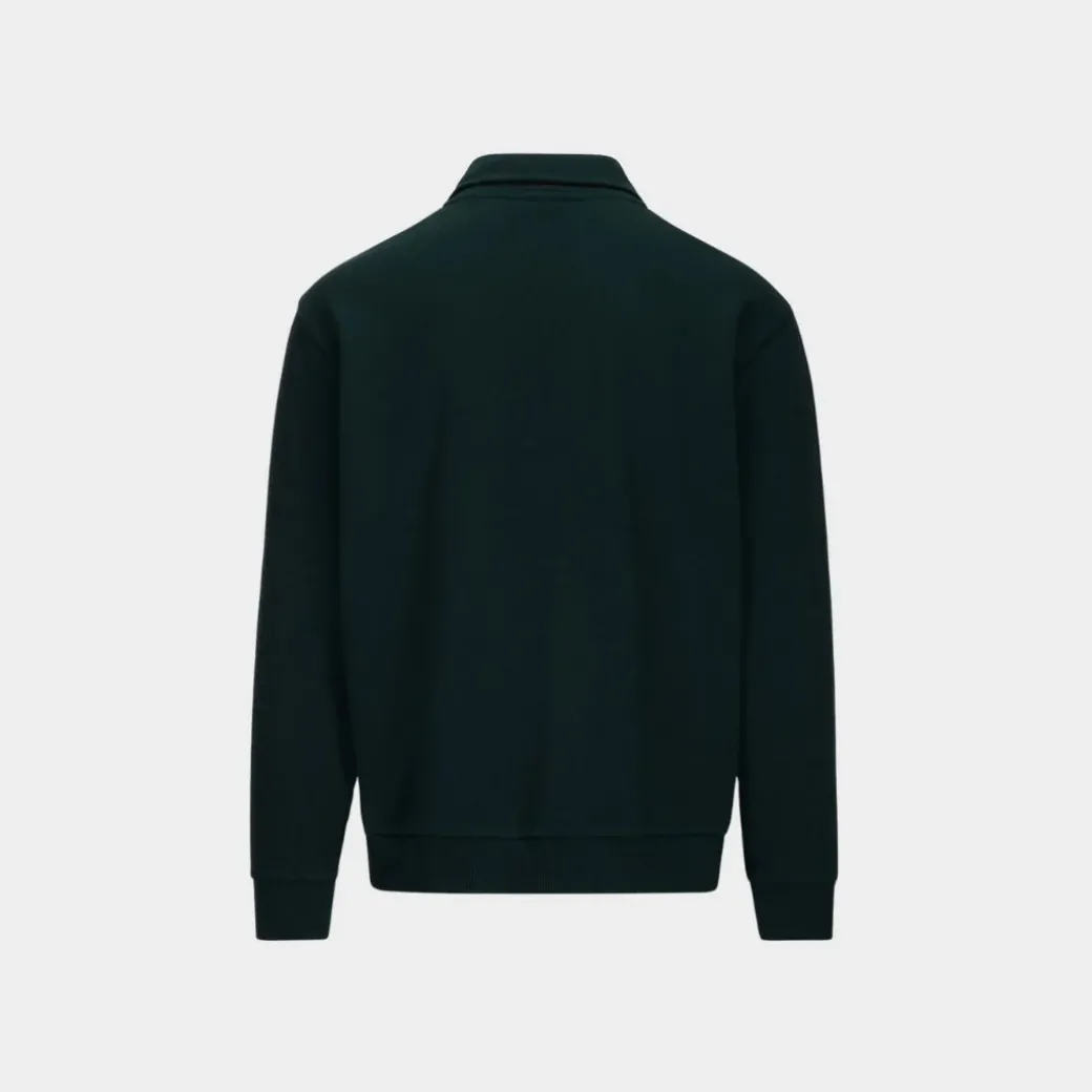 Sudadera de hombre con cuello de felpa cepillada en algodón orgánico. Ajuste cómodo. Apertura frontal con media cremallera, puños acanalados y borde inferior. Gráfico impreso en la parte frontal.