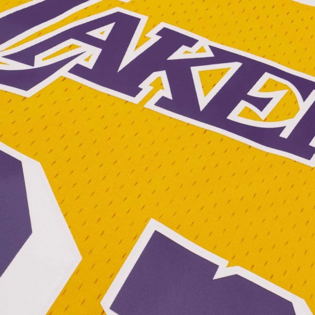 Representa a tu equipo y jugador favoritos en cualquier momento con la camiseta NBA Swingman Hardwood Classics, que reproduce la que Los Angeles Lakers usaban en la cancha durante esa época. Incluye aplicaciones de sarga con el logotipo, el nombre y el número serigrafiados con calor. El cuerpo está hecho de malla 100 % poliéster. Etiqueta deportiva tejida Hardwood Classics-Mitchell u0026amp; Ness en la parte inferior izquierda delantera.