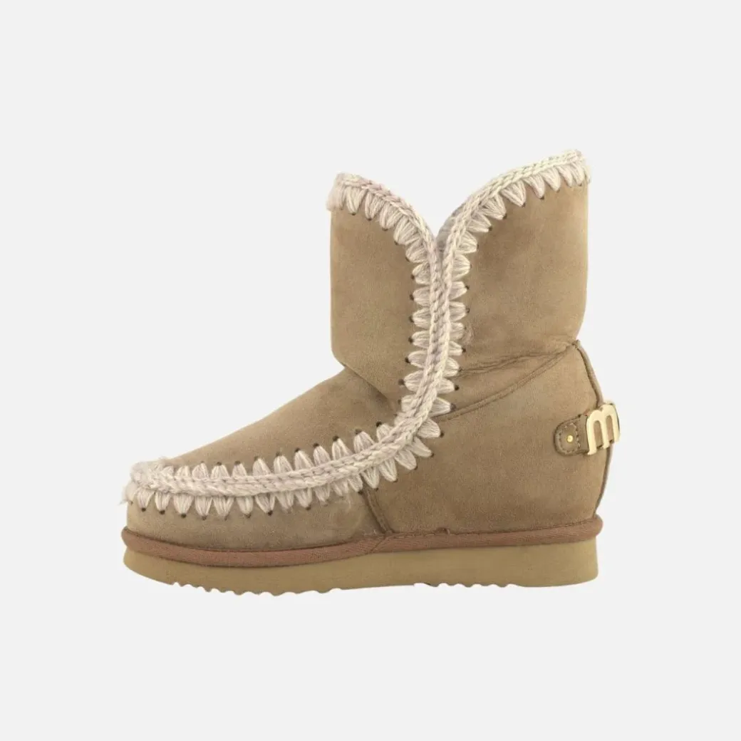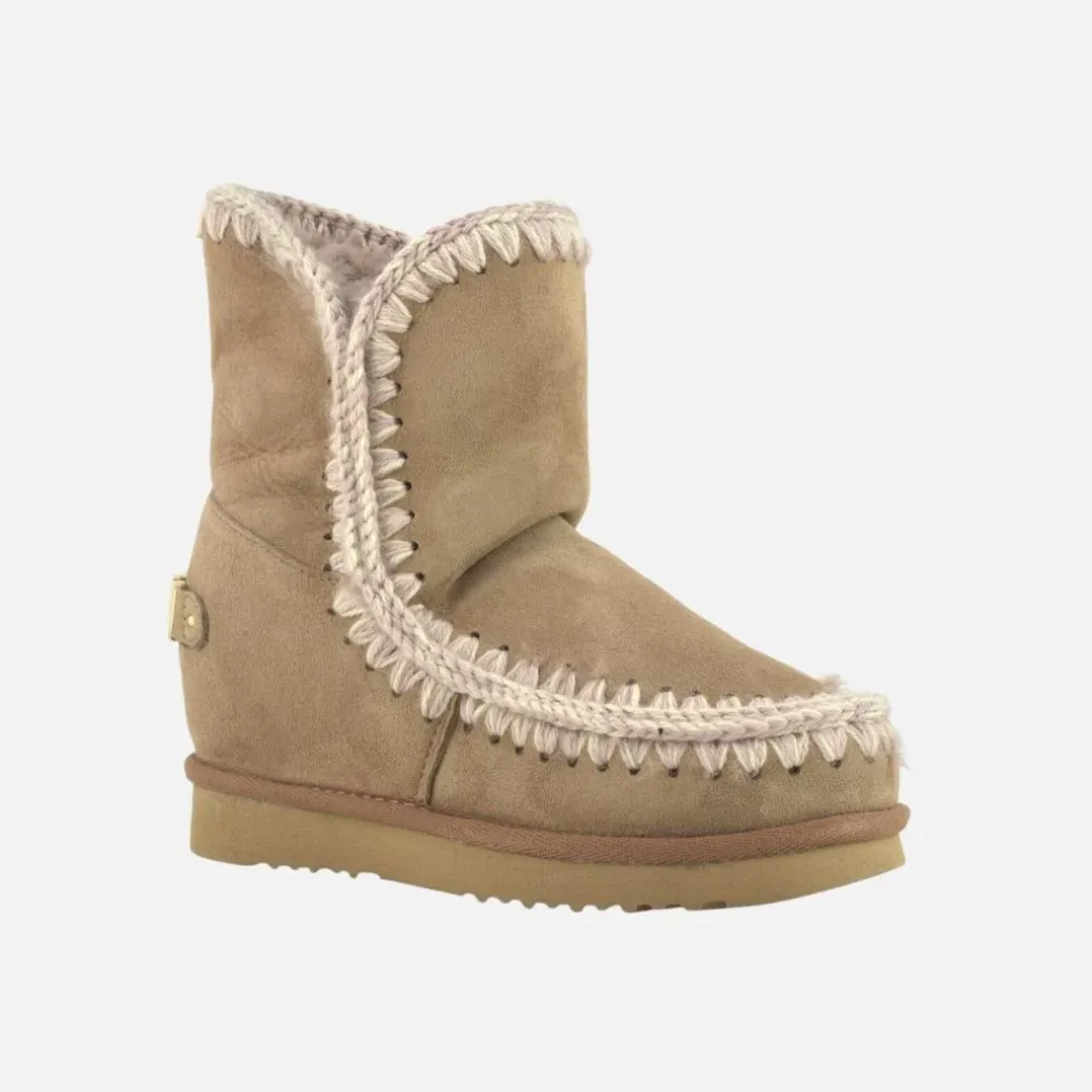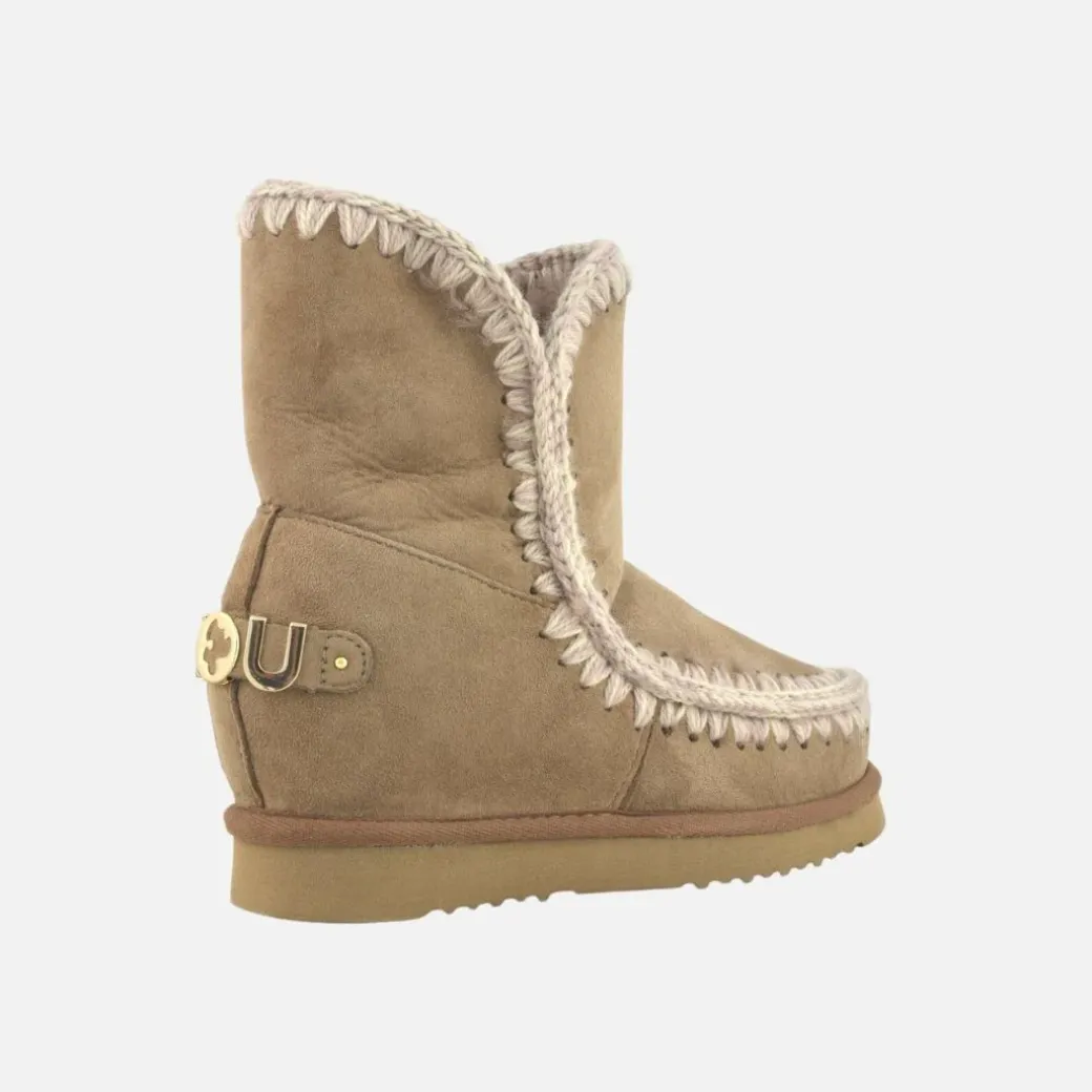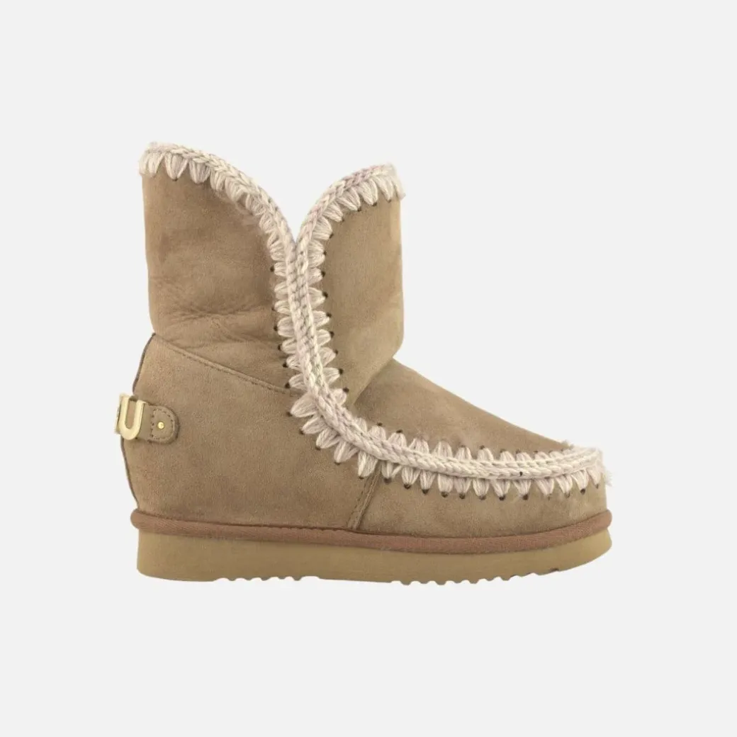 Una pieza esencial en el vestuario invernal de mou, las eskimo de cuña baja con un gran logo metálico representan lo mejor del icono mou con un tacón oculto de 5 cm y una forma más estilizada. Increíblemente cómodas y favorecedoras, este modelo está elaborado con suave piel genuina de oveja, con costuras de lana tejidas a mano, un soporte de apoyo para el talón y una resistente suela de EVA. Altura 23 cm. Regular fit.