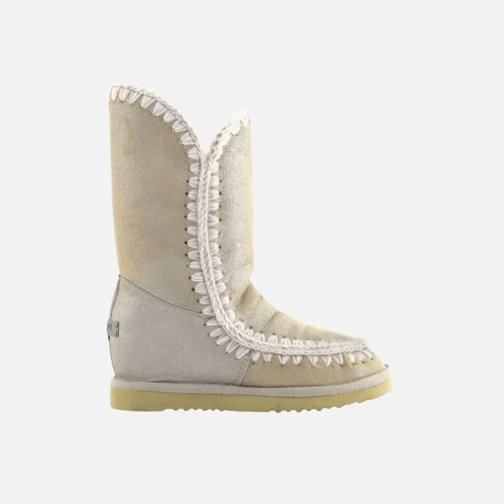 La línea eskimo de cuña fina tiene un tacón oculto de 5 cm y es increíblemente cómoda. Fabricadas por manos expertas con suave piel de oveja de doble cara con las características costuras de ganchillo de la marca, un soporte de apoyo para el talón y suela de EVA, las eskimo de cuña alta están disponibles en una amplia gama de acabados de gamuza y cuero metálico. Altura 30,5 cm.