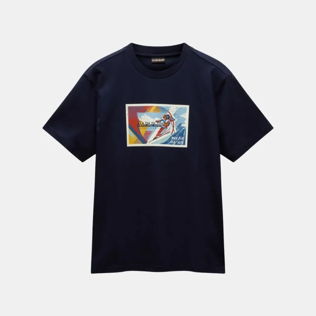La camiseta de manga corta Portalet presenta un diseño inspirado en la estética deportiva, con corte holgado, cuello redondo de canalé y estampados gráficos de esquí en la parte delantera.