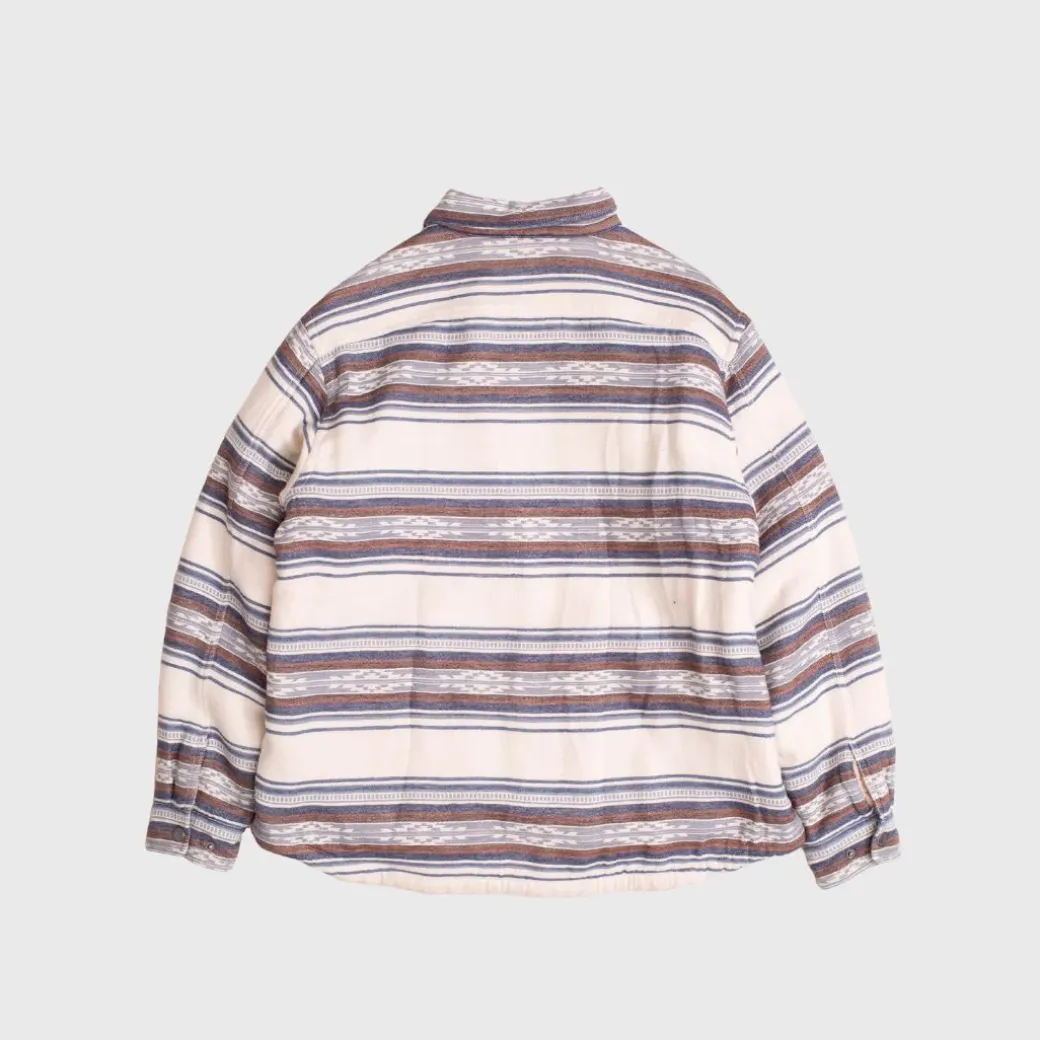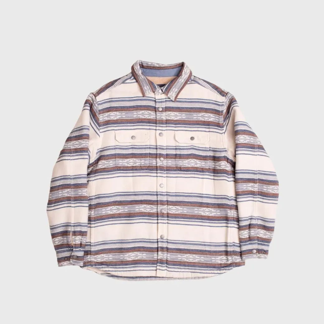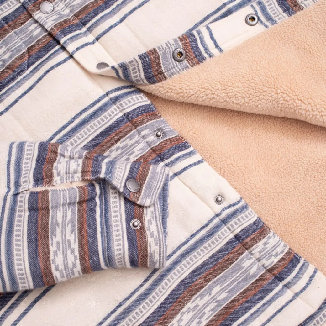 La camisa Saltillo con forro de sherpa es una prenda ideal para usar en capas a partir del otoño. El forro aporta calidez sin abultar a una chaqueta tipo camisa Double Soft Chamois con rayas Saltillo, un patrón derivado de las icónicas mantas Pendleton.