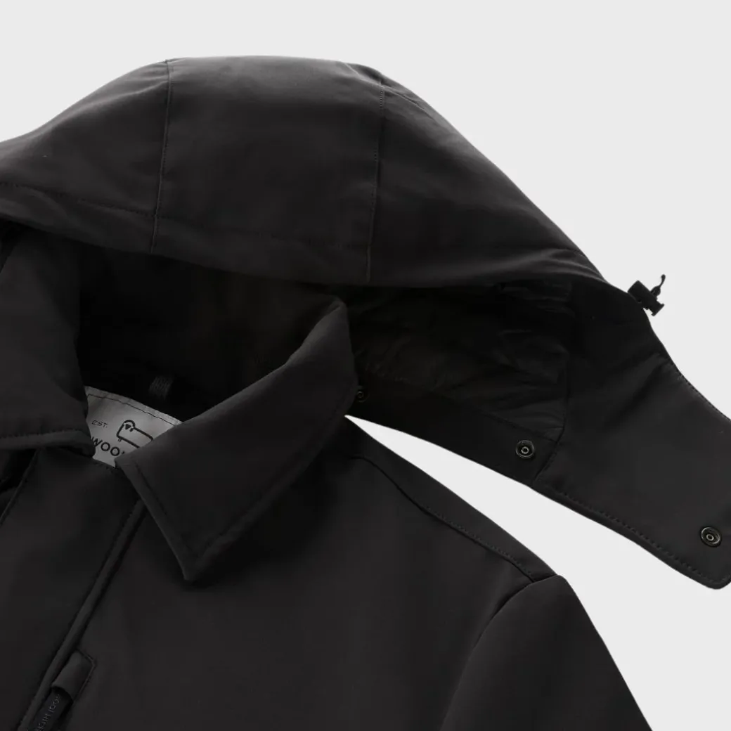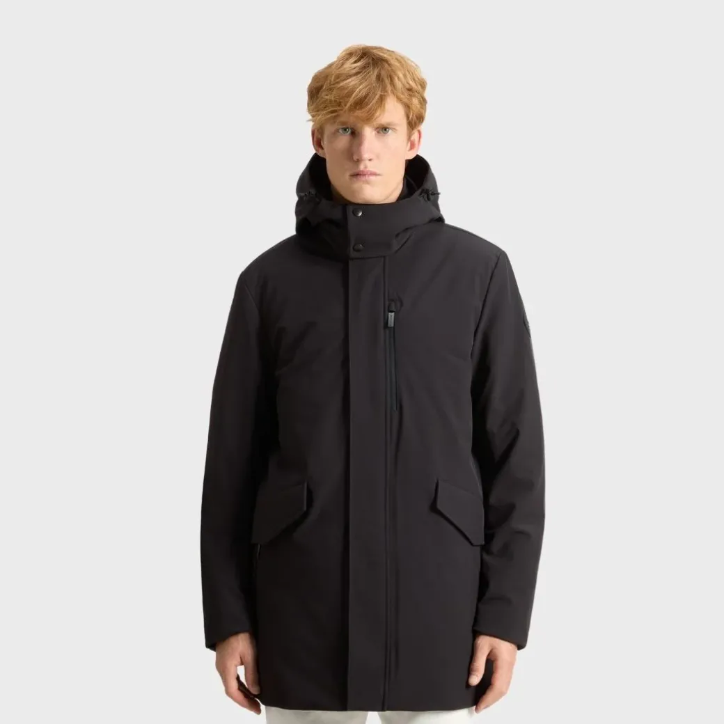 Una prenda exterior refinada, lista para protegerte de las inclemencias del tiempo: este abrigo es una solución inteligente para las aventuras cotidianas. Confeccionado con tejido Tech Softshell cortavientos e impermeable, lleva relleno de plumón de pato para asegurar una mayor calidez. Caracterizado por un clásico cuello camisero y por detalles sobrios que realzan su encanto urbano, este modelo cuenta con una capucha desmontable con botones a presión y múltiples bolsillos con cremallera impermeable para mantener los objetos importantes seguros en todo momento.