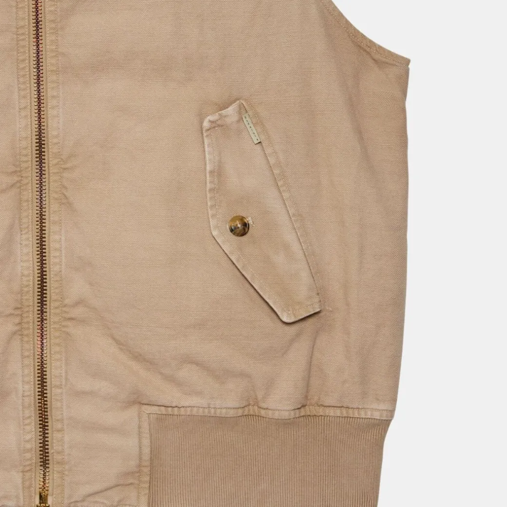 - Tejido de lona en algodón regenerativo con tratamiento de tinte en prenda que le da un aspecto usado.