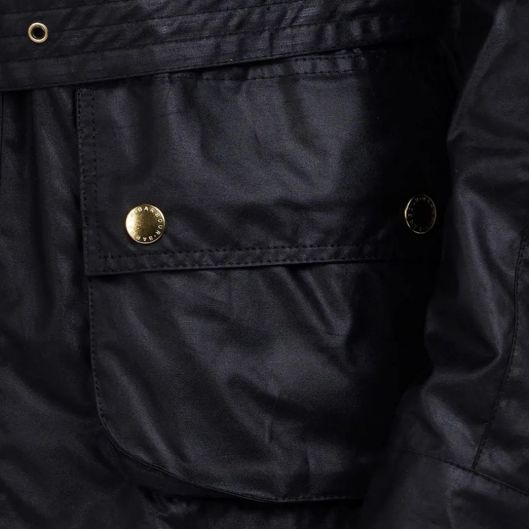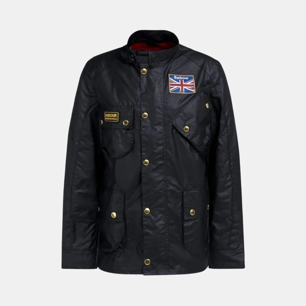 Los detalles distintivos de la chaqueta de motociclista incluyen puños ajustables con tachuelas, una correa de cuello y cinturón con cierre de hebilla y los cuatro bolsillos con tachuelas característicos, uno de los cuales es el auténtico bolsillo inclinado para mapas, diseñado para brindar un fácil acceso mientras conduces. Una insignia de Union Jack agrega un toque patriótico adicional al pecho, acompañada por la inimitable marca Barbour International.