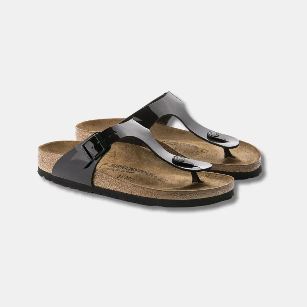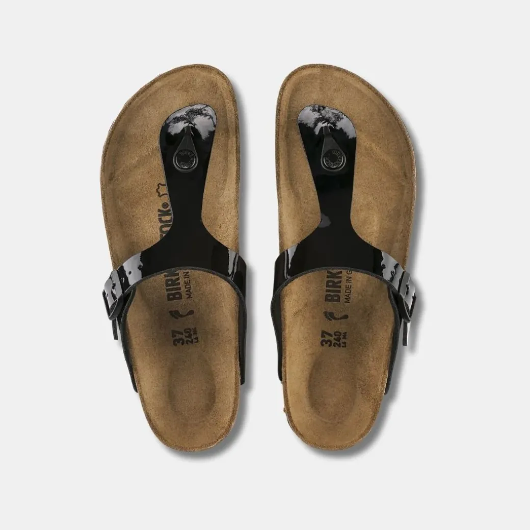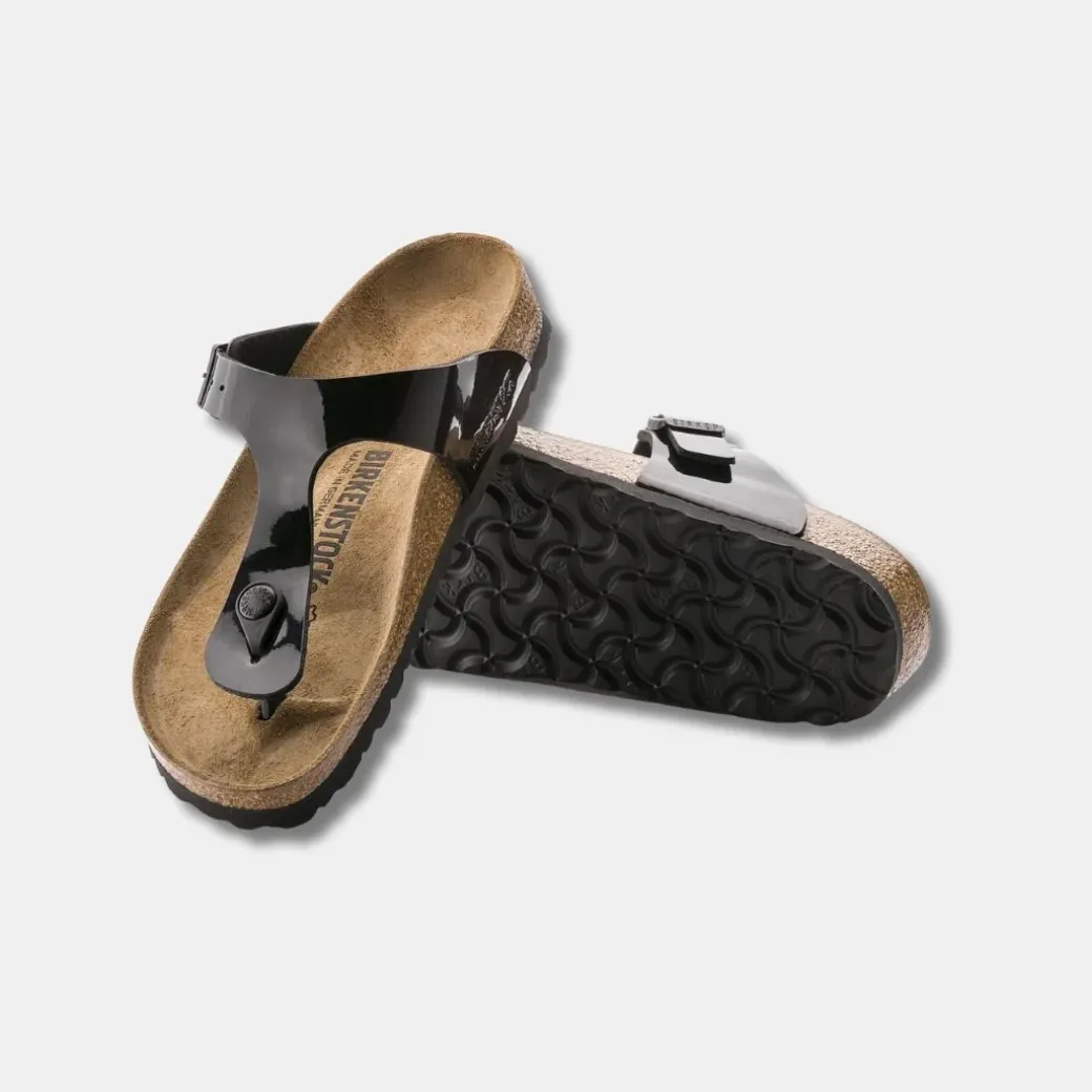 La moderna sandalia de dedo de Birkenstock. El Gizeh es un auténtico clásico con soporte exclusivo y un estilo refinado y minimalista. Se muestra en un divertido y brillante Birko-Flor® de charol.