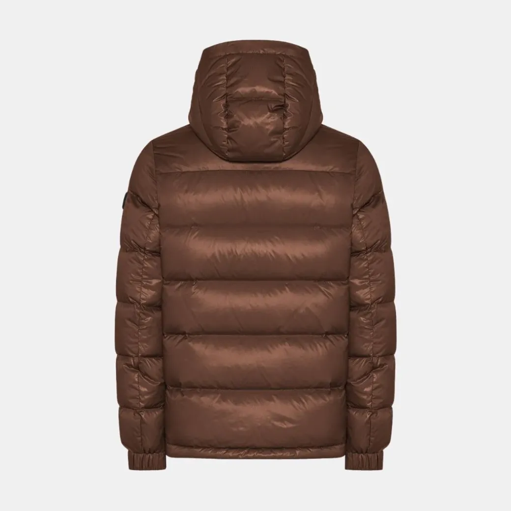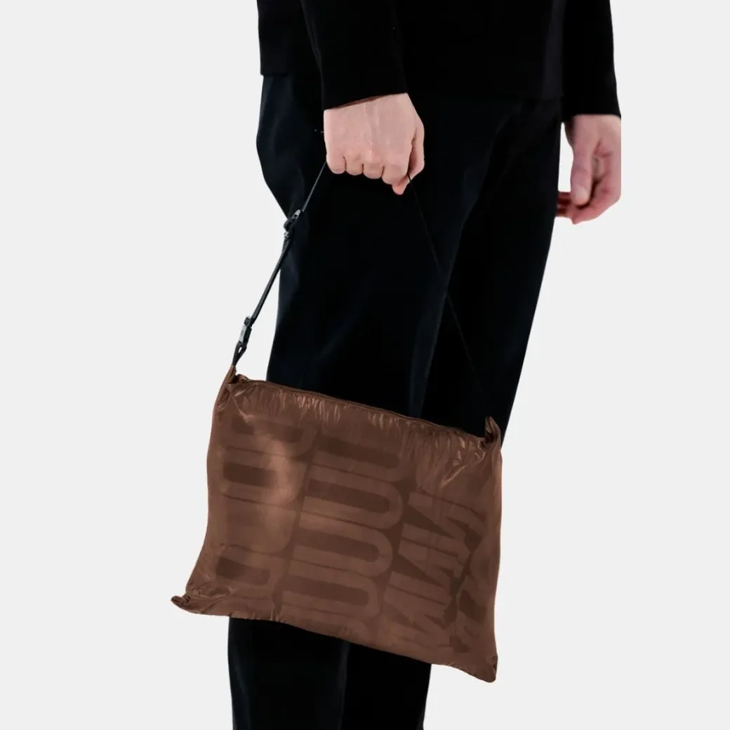 Plumífero plegable en nailon superligero semitransparente con acabado súper brillante. Cierre frontal con cremallera de doble cursor y cremallera bajo de neopreno con logo en relieve en el interior. Capucha ajustable con cordón, bolsillos laterales con cremallera y cordón en el bajo para regular el calce. Puño elástico con tira ajustable con botones a presión y bolsillos internos multifuncionales. La prenda, caracterizada por el logo estampado en toda la prenda en el forro, se puede plegar en el bolsillo interno con cremallera para convertirse en un bolso con bandolera.