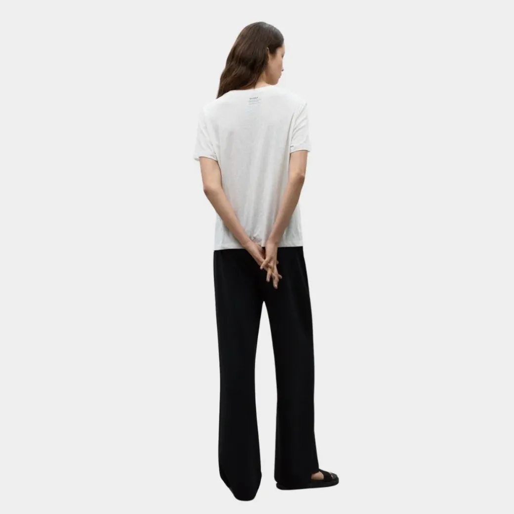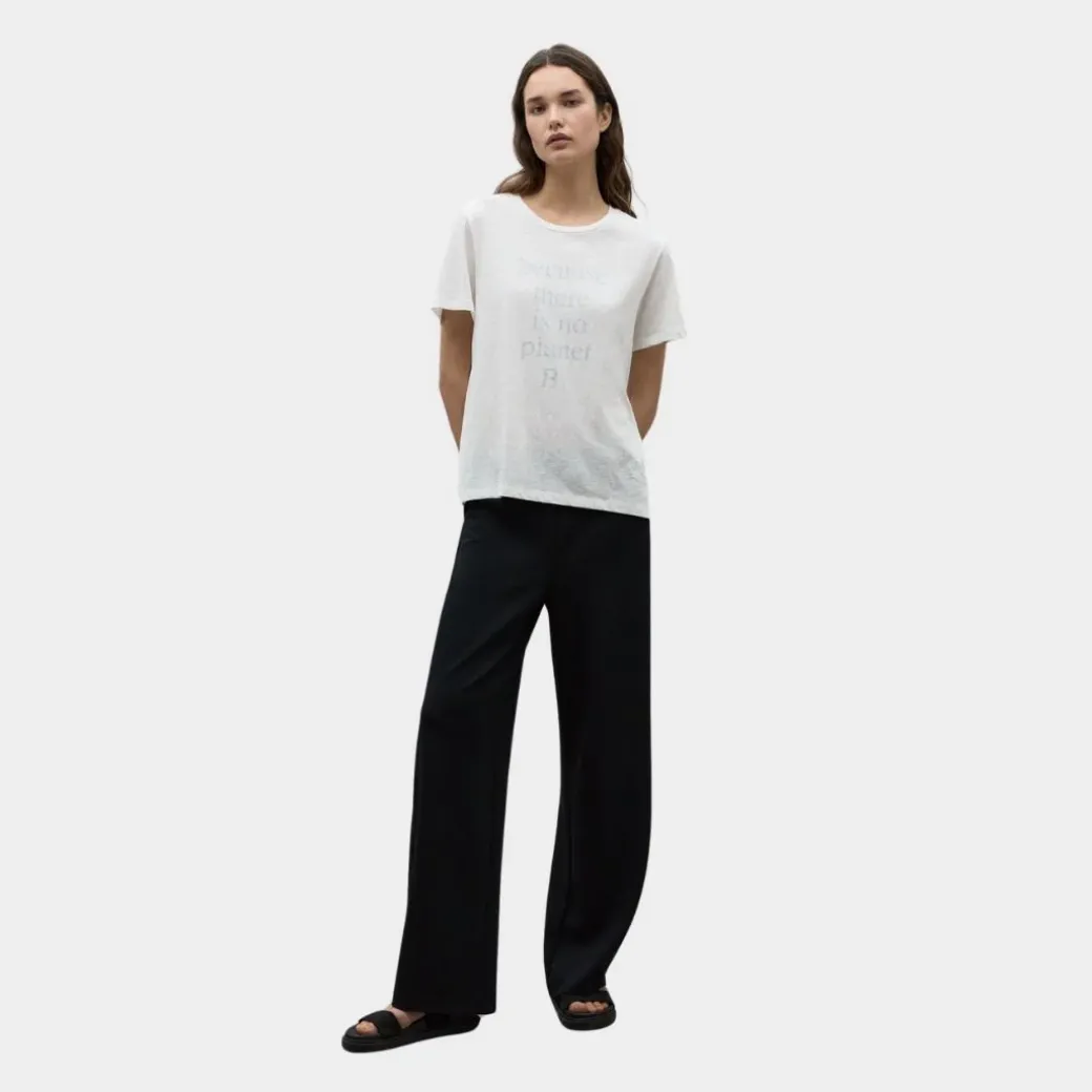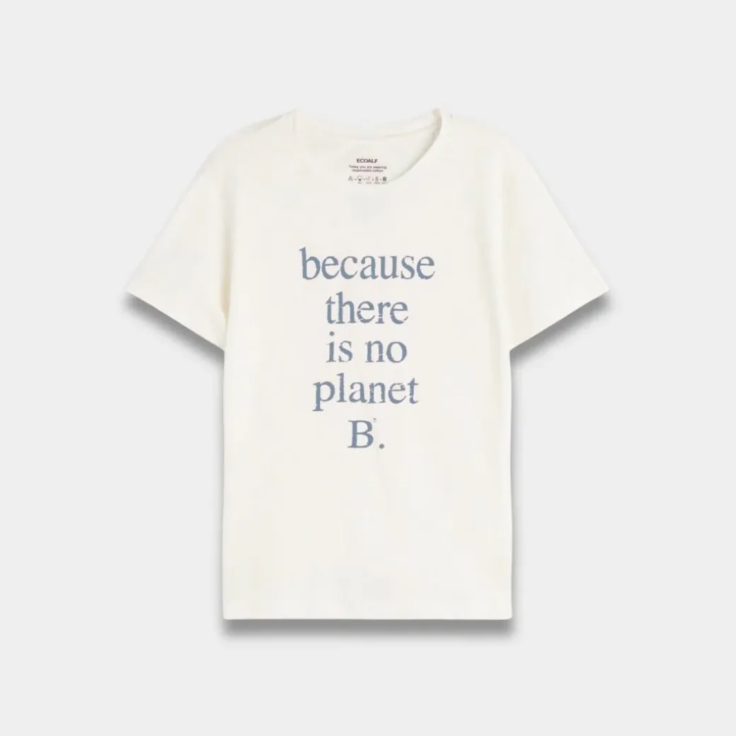 La camiseta de manga corta Lovisa está hecha de 80% Algodón orgánico, material cultivado de manera natural que nos permite reducir el uso de agua empleada en el proceso de producción. en la parte delantera encontrarás el claim impreso: Because There Is No Planet B®.