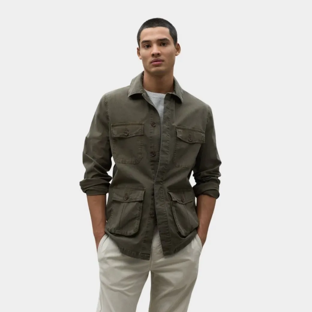 La chaqueta Safari está hecha de una mezcla de algodón y algodón reciclado, obtenido mediante la recolección, clasificación y proceso de prendas usadas o residuos textiles que contienen algodón. Una alternativa sostenible que aprovecha materiales existentes y reduce el impacto ambiental asociado con la producción textil.