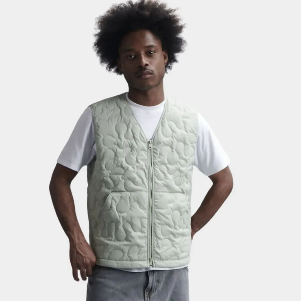 El chaleco EDWIN Camper es una chaqueta sin mangas ligeramente acolchada con dos bolsillos delanteros y una etiqueta EDWIN bordada. El chaleco está hecho de 96% nailon y 4% elastano.