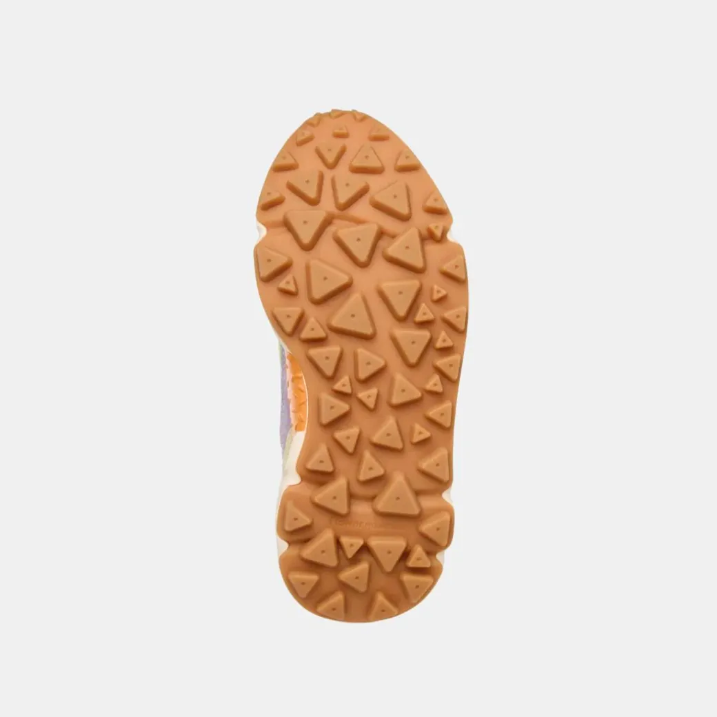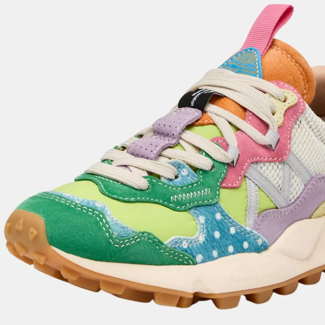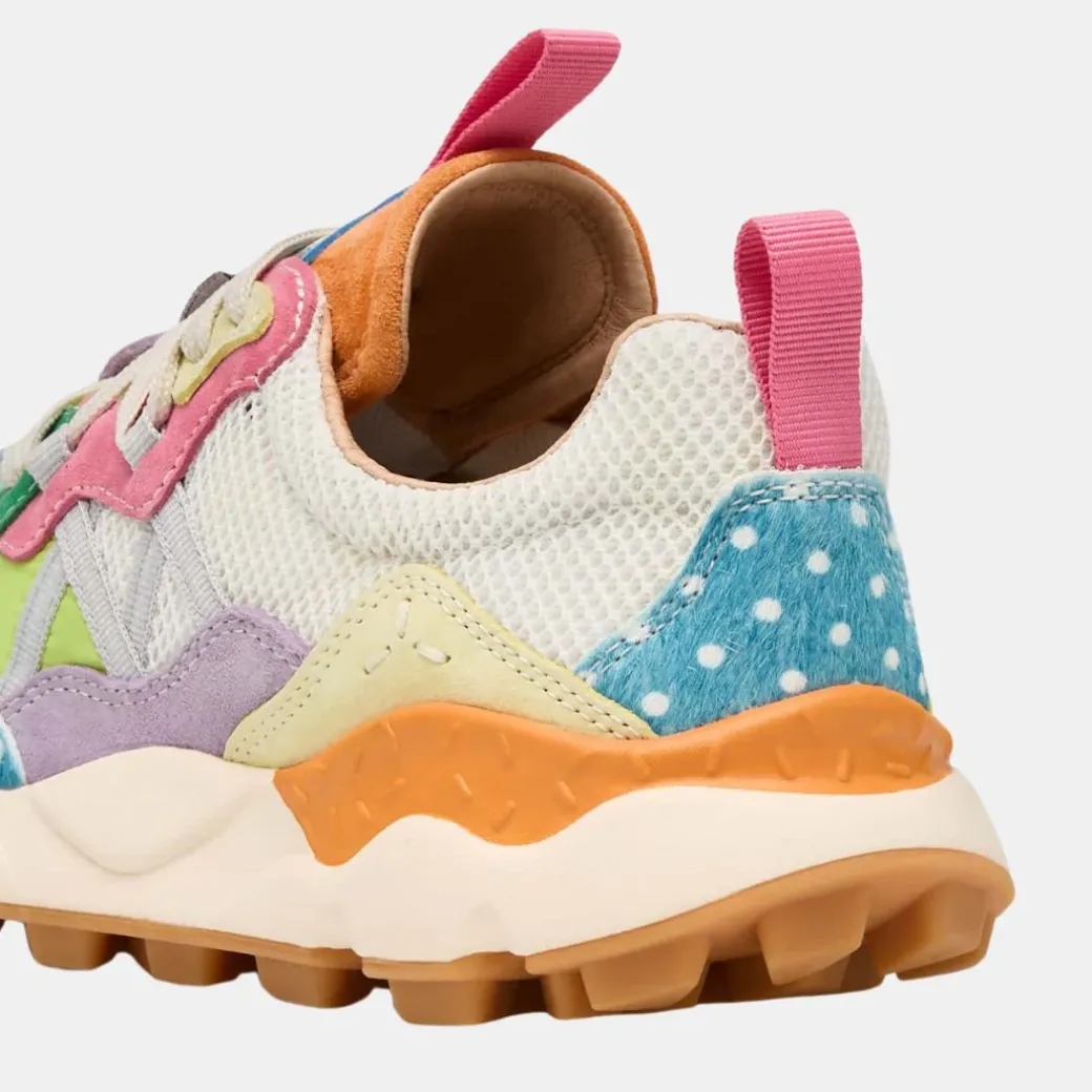 Zapatilla con construcción outdoor, con parte superior en tejido técnico. Las inserciones de ante multicolor se complementan con detalles de piel de poni de colores con estampado de lunares. Forro de piel y plantilla de corcho natural antibacteriano. Suela de goma con dibujo dentado.