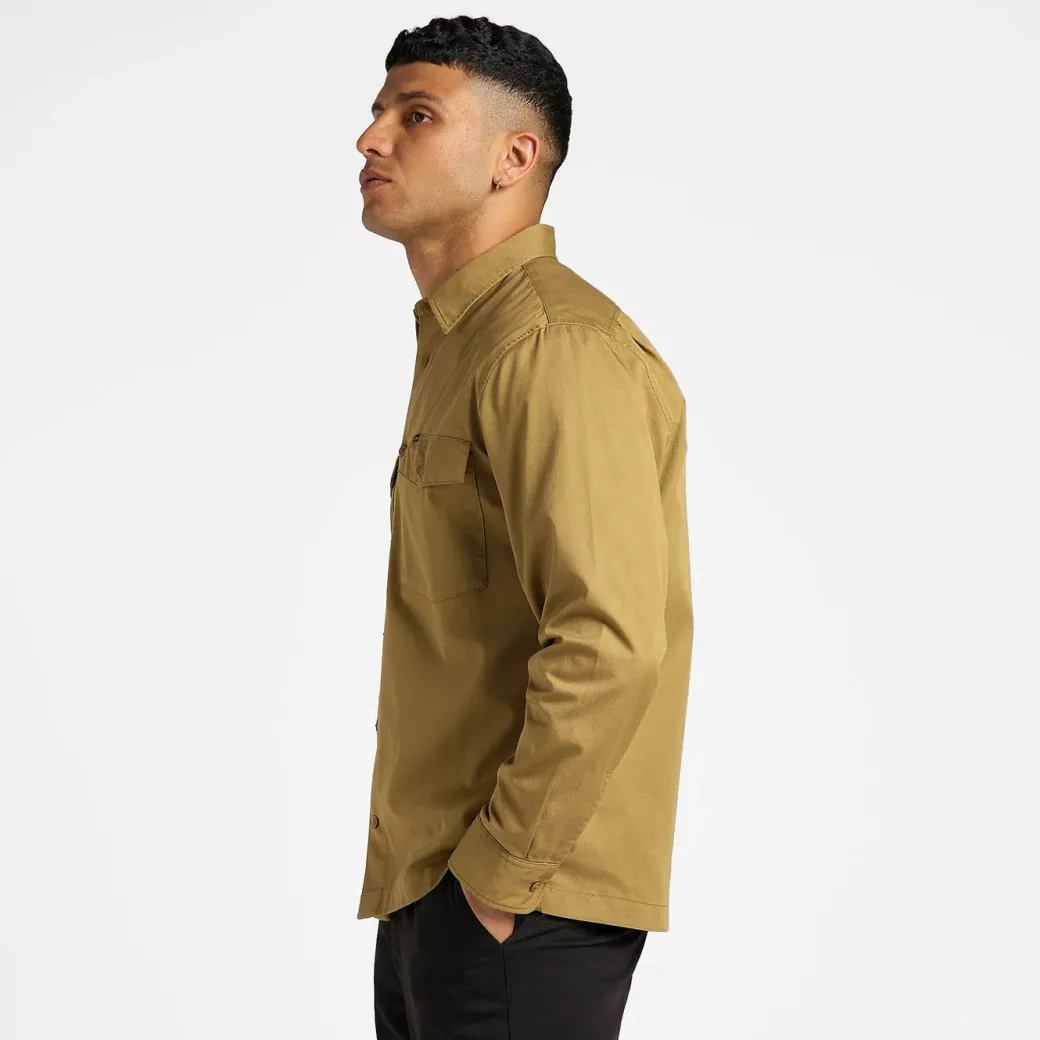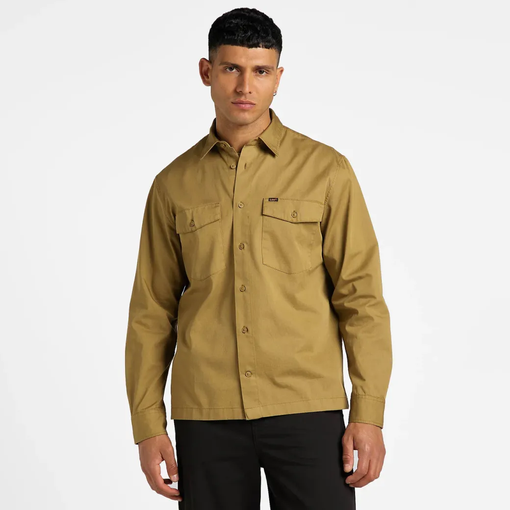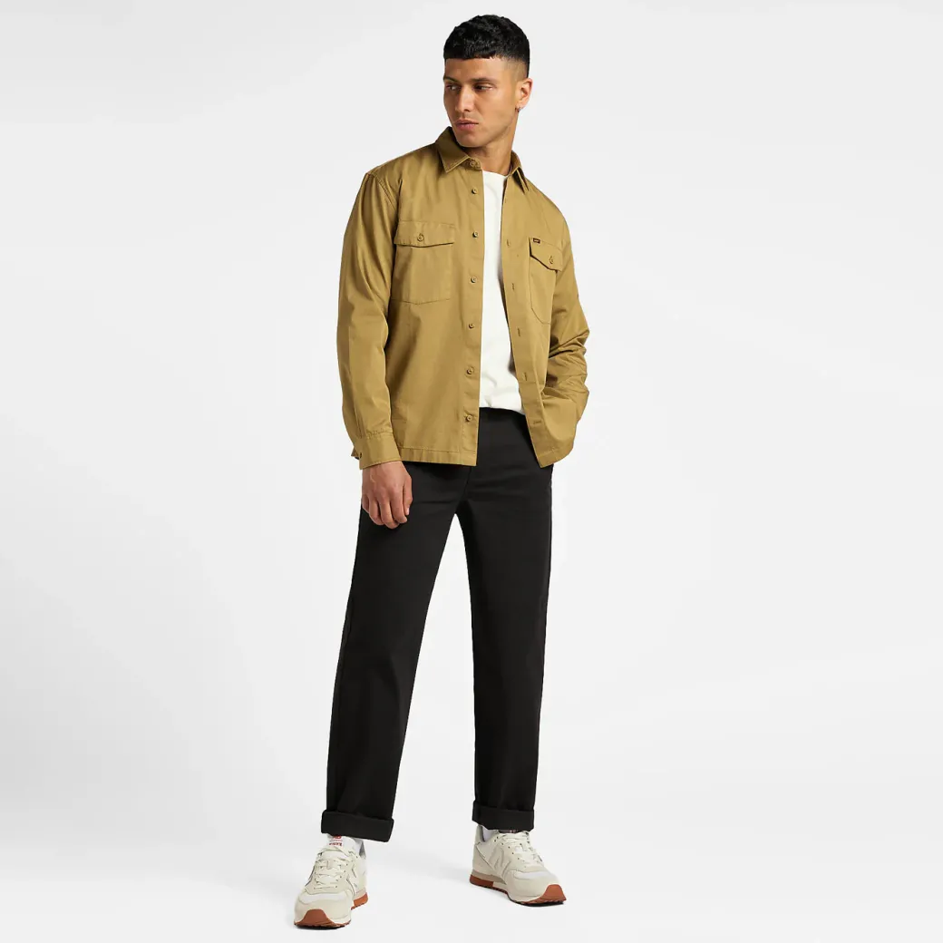 Los detalles incluyen dos bolsillos en el pecho con solapas puntiagudas y botones a juego, mientras que el logotipo de Lee en negro y dorado aparece en la parte superior del bolsillo izquierdo, que recuerda a la ropa de trabajo clásica.