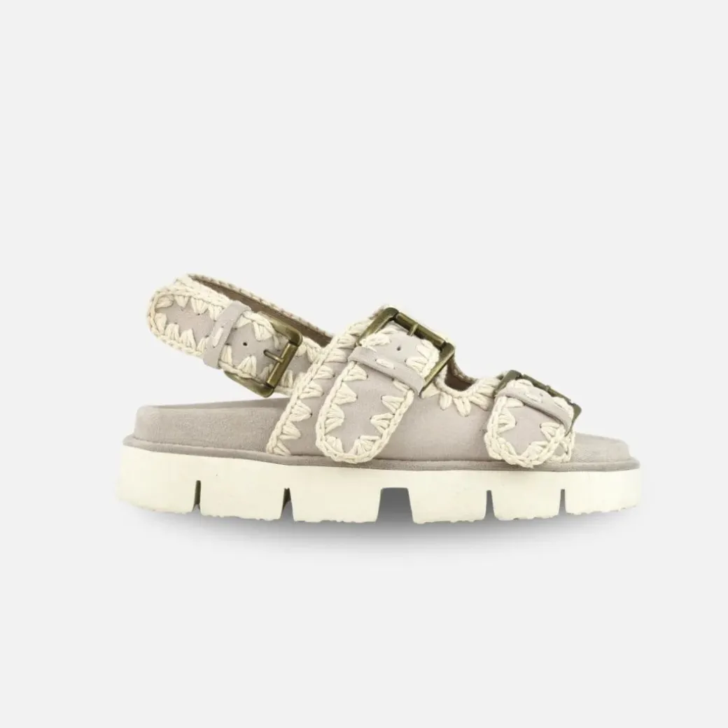 Las nuevas sandalias bio con hebilla ofrecen el look perfecto para un verano relajado y elegante. Completa con dos correas delanteras, una trasera, la característica costura de ganchillo de Mou, una ligera suela exterior de EVA y plantilla de ante para mayor comodidad.