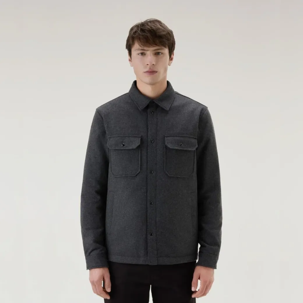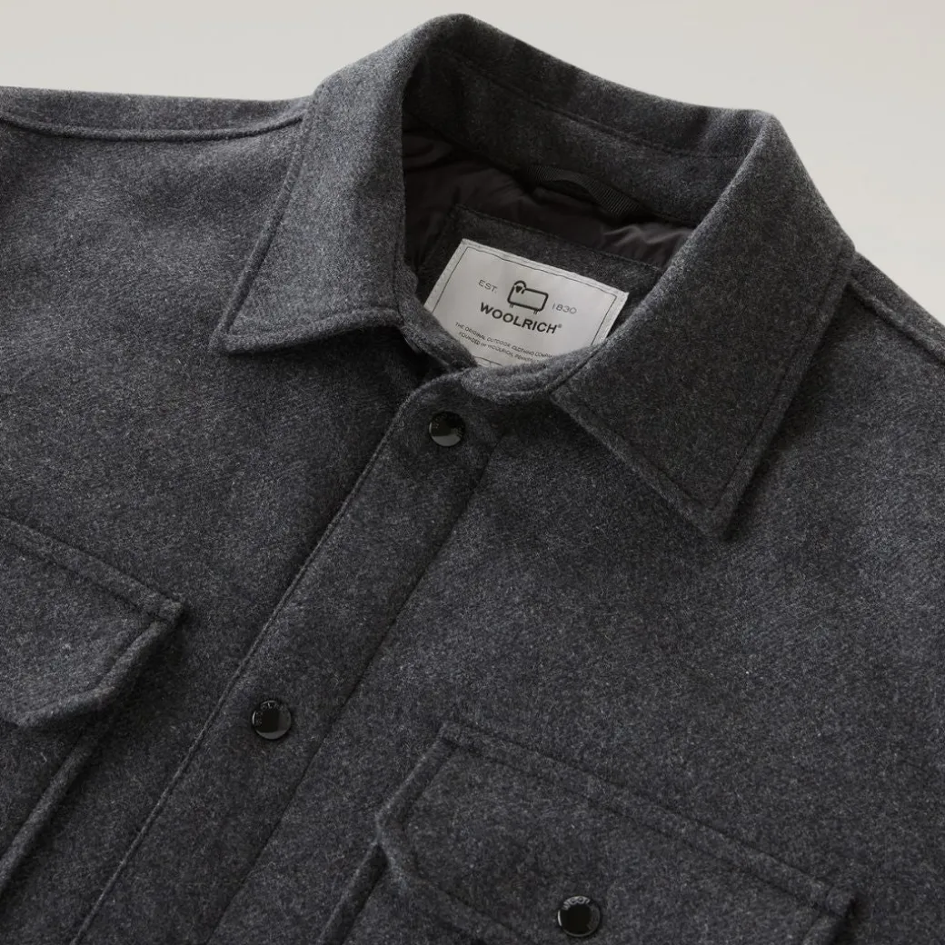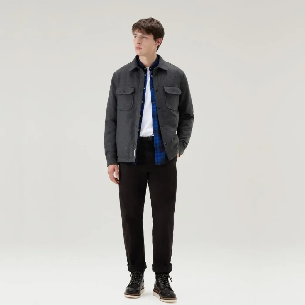 Informal y cómodo, para llevar sobre una camiseta o un jersey, es una prenda imprescindible en tu armario. Confeccionada con una mezcla de lana Melton italiana y reciclada, esta sobre camisa está acolchada con plumón de pato y forrada con nailon acolchado para brindar calidez y comodidad. Una serie de detalles inspirados en la ropa de trabajo completan la silueta limpia, incluido el clásico cuello puntiagudo, el cierre con botones a presión y los bolsillos con solapa y botones a presión.