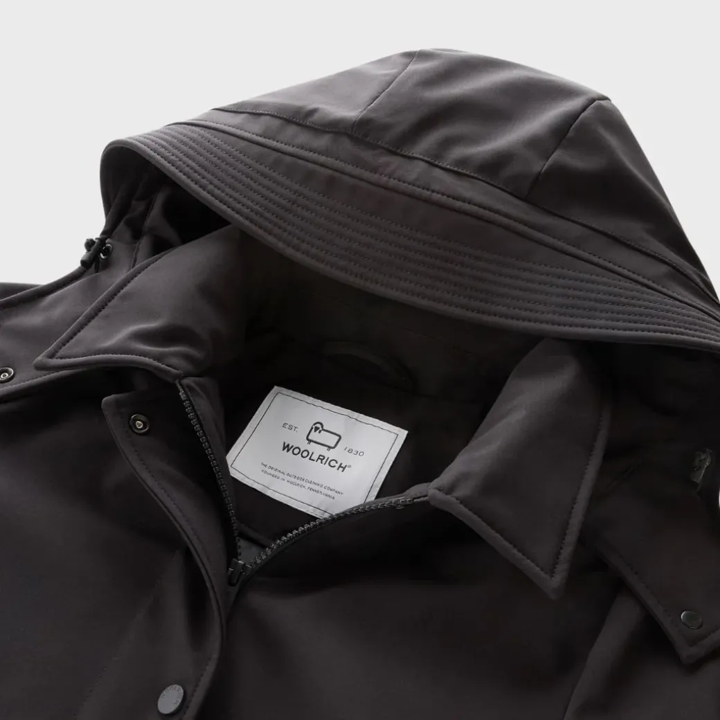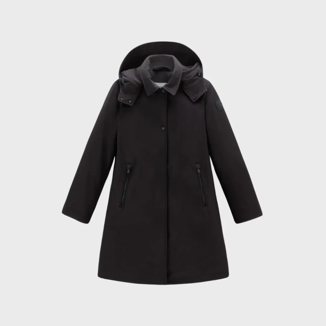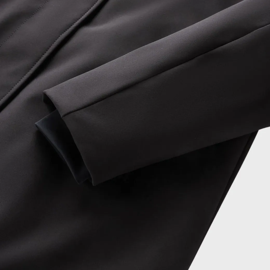 La silueta de la clásica gabardina reinventada en versión Tech Softshell, un tejido impermeable y cortavientos. Acolchada con plumón de pato y con acolchado Chevron en el interior, tiene una capucha desmontable con dos botones a presión y un cuello en punta. El cierre de doble cremallera y botón a presión está oculto por una solapa con dos botones visibles para un look minimalista. Tiene dos prácticos bolsillos exteriores de ribete con cremallera y un bolsillo interior vertical con cremallera. Los puños de canalé elástico bloquean el viento y garantizan una sensación más cómoda.